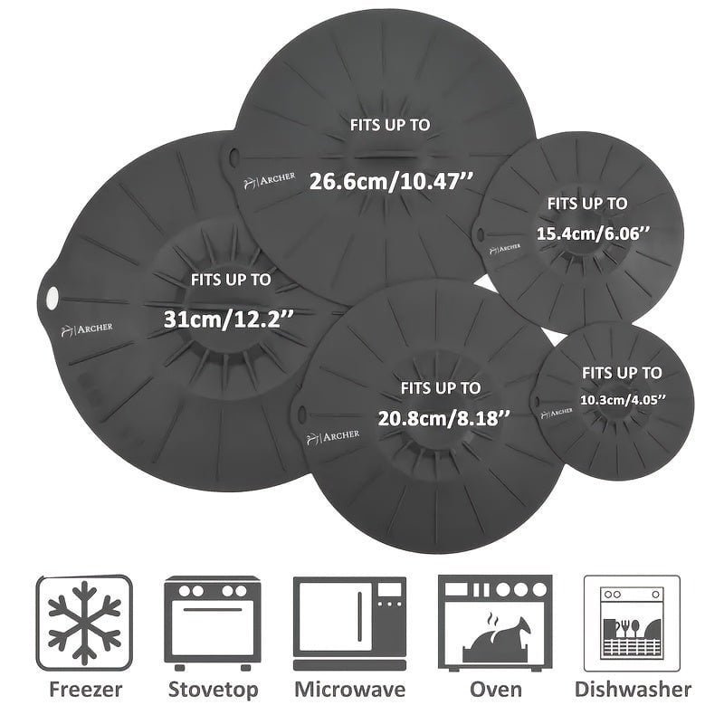 【MULTIPURPOSE VERSATILITY】Totally 5 Sizes- 4 inch. 6 inch. 8 inch. 10 inch and extra large 11.7nch. The sizes in between vary and they will fit almost anything!! Such as Pot. Pan. Dish. Plate.Bowls.Container.Coffee Cup Jar.Can and more. Great for Cooking and Baking .Also Perfectly and Safely use for Microwave. StoveTop. Oven. Fridge and Freezer Safe. Withstands temperatures from -104 degrees F to 450 degrees F.
